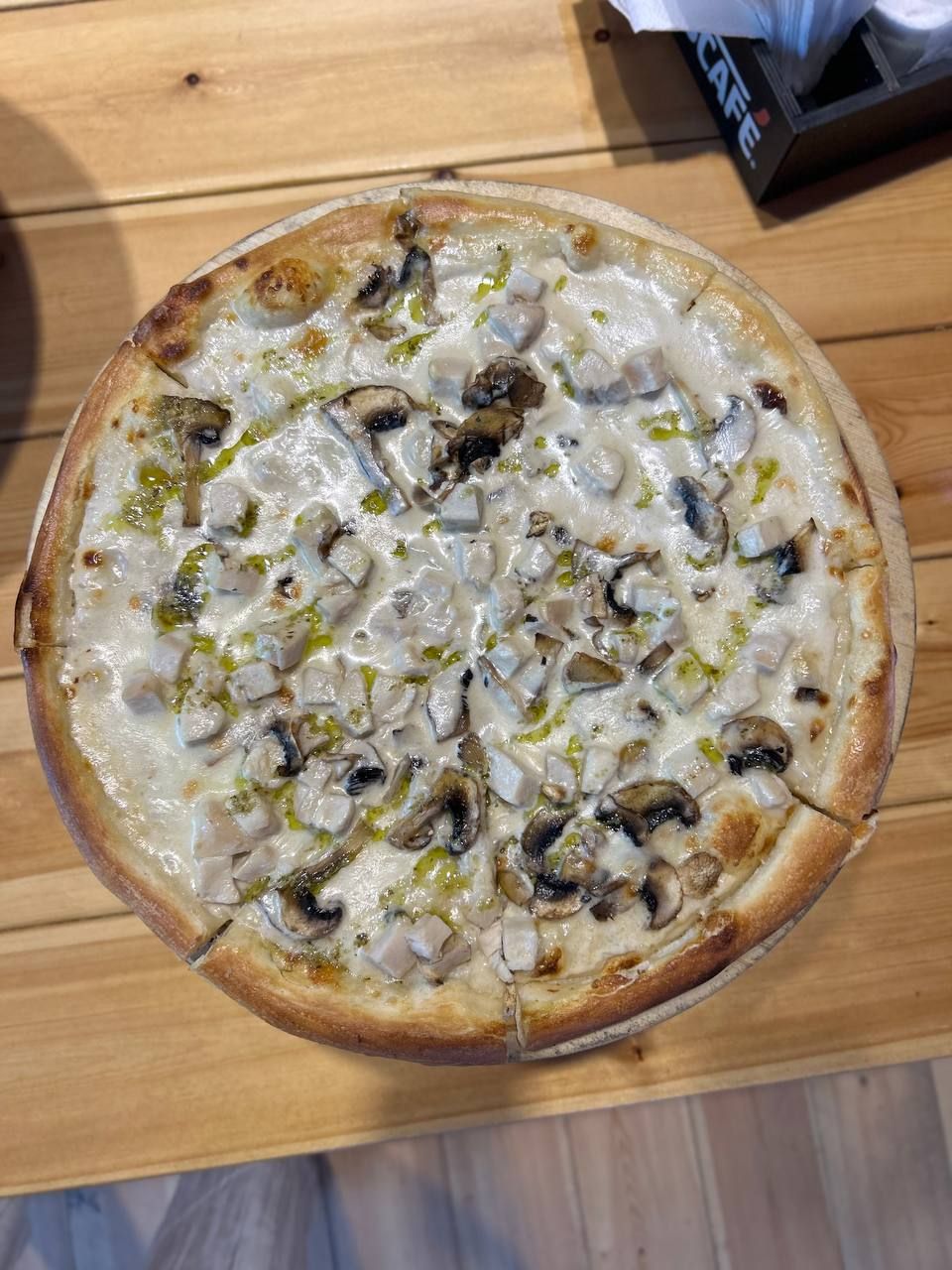 - Выдержанное тесто собственного замеса из Итальянской муки, моцарелла классическая, филе куриное, шампиньены свежие, фирменный "белый" соус