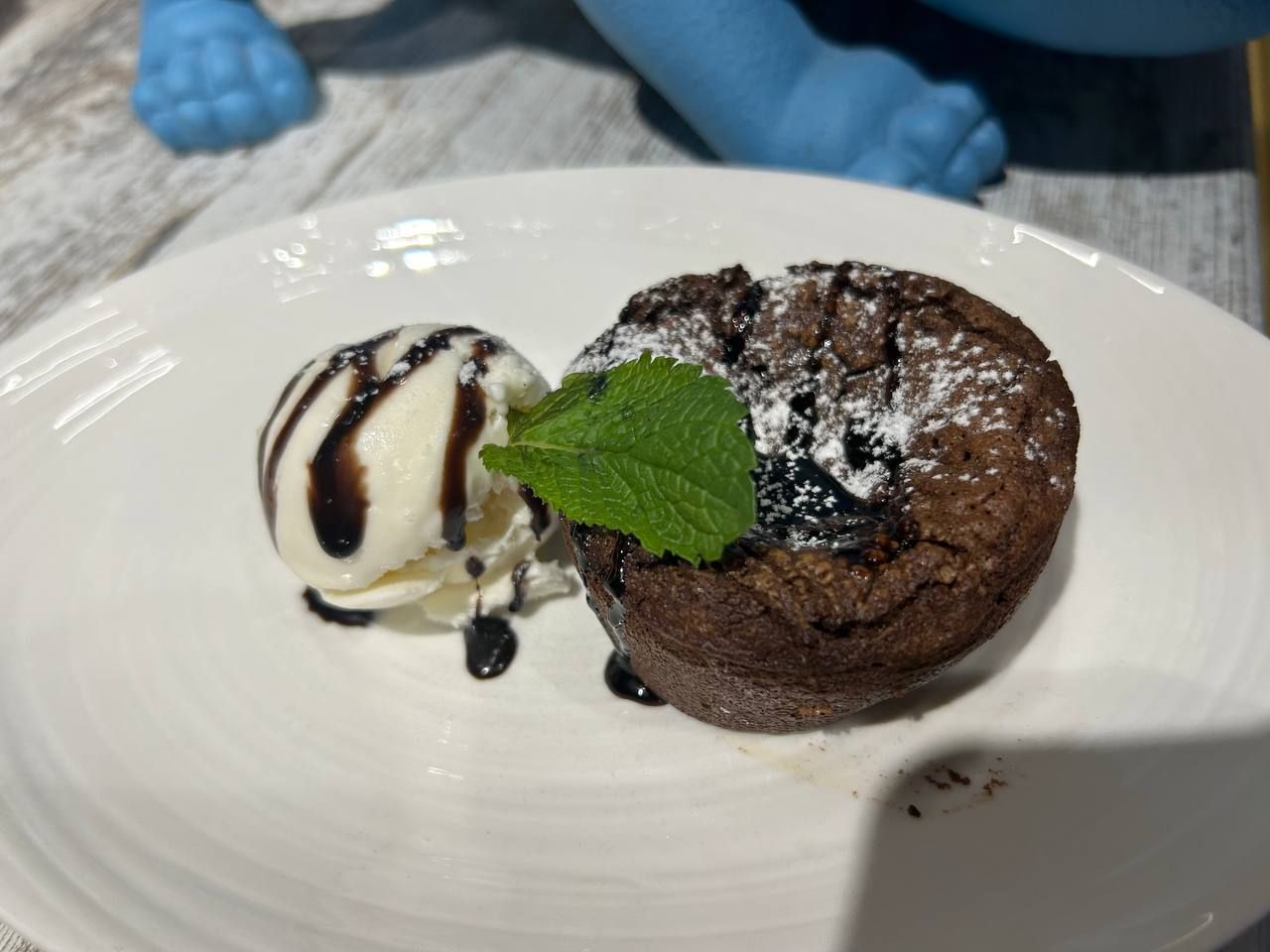 - Расплавленная шоколадная сердцевина, шарик ванильного мороженого, шоколадный топпинг